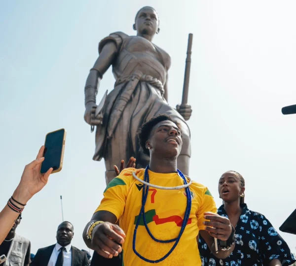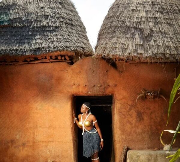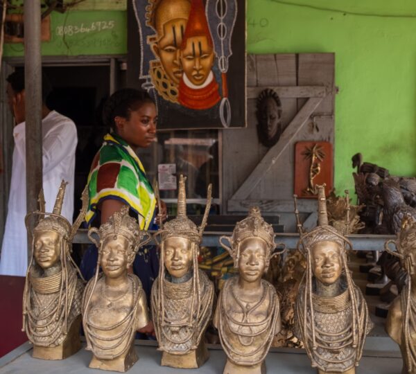 A tourist looks at bronze art pieces on display for sale in a shop on Igun Street, in Benin City on November 10, 2025. Benin City has been known for centuries as the center of artisanal bronze and brass craftsmanship, the most famous emblems of which are the "Benin Bronzes," works of art that once adorned the royal palace and were looted in 1897 by the British army during a punitive expedition that resulted in the city's sacking.